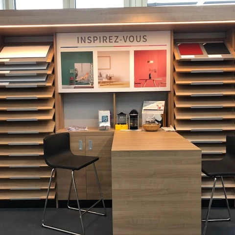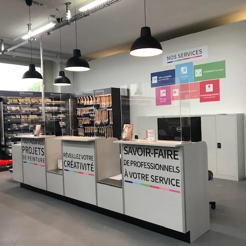 Conception et réalisation clé en main de plusieurs points de vente en Suisses Romande conçus pour la mise en valeur de peintures et accessoires, dans le respect du cahier des charges et des délais.